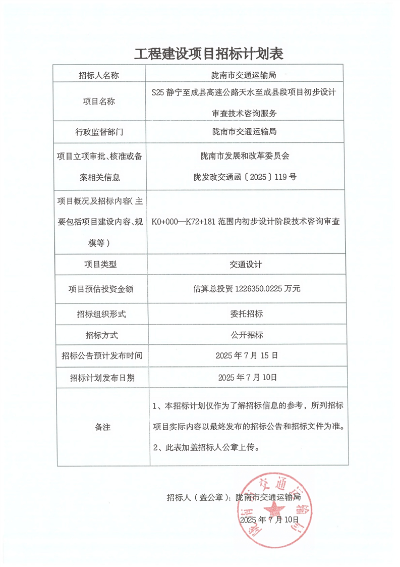 S25靜寧至成縣高速公路天水至成縣段項(xiàng)目初步設(shè)計(jì)審查技術(shù)咨詢(xún)服務(wù)