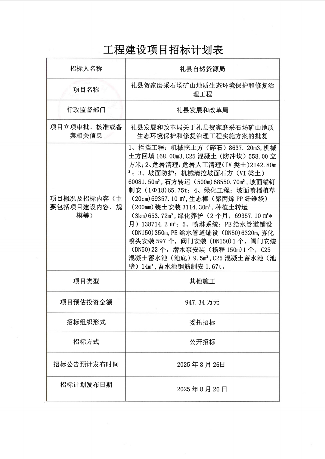 禮縣賀家磨采石場(chǎng)礦山地質(zhì)生態(tài)環(huán)境保護(hù)和修復(fù)治理工程