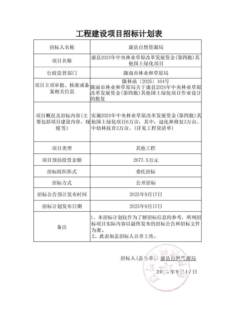 康縣2024 年中央林業(yè)草原改革發(fā)展資金(第四批)其他國土綠化項(xiàng)目