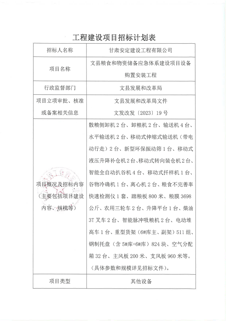 文縣糧食和物資儲(chǔ)備應(yīng)急體系建設(shè)項(xiàng)目設(shè)備購置安裝工程