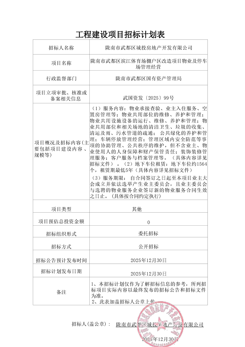 隴南市武都區(qū)濱江體育場(chǎng)棚戶(hù)區(qū)改造項(xiàng)目物業(yè)及停車(chē)場(chǎng)管理經(jīng)營(yíng)