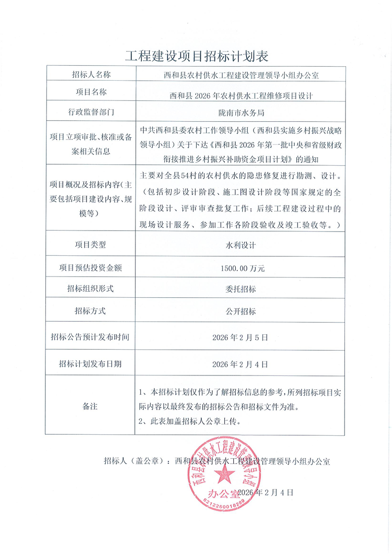 西和縣2026年農(nóng)村供水工程維修項(xiàng)目設(shè)計