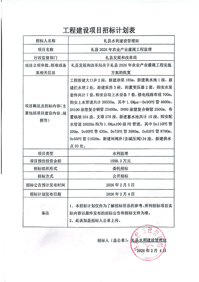 禮縣2026年農業(yè)產業(yè)灌溉工程監(jiān)理