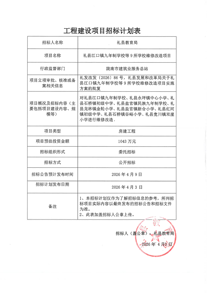禮縣江口鎮(zhèn)九年制學校等9所學校維修改造項目