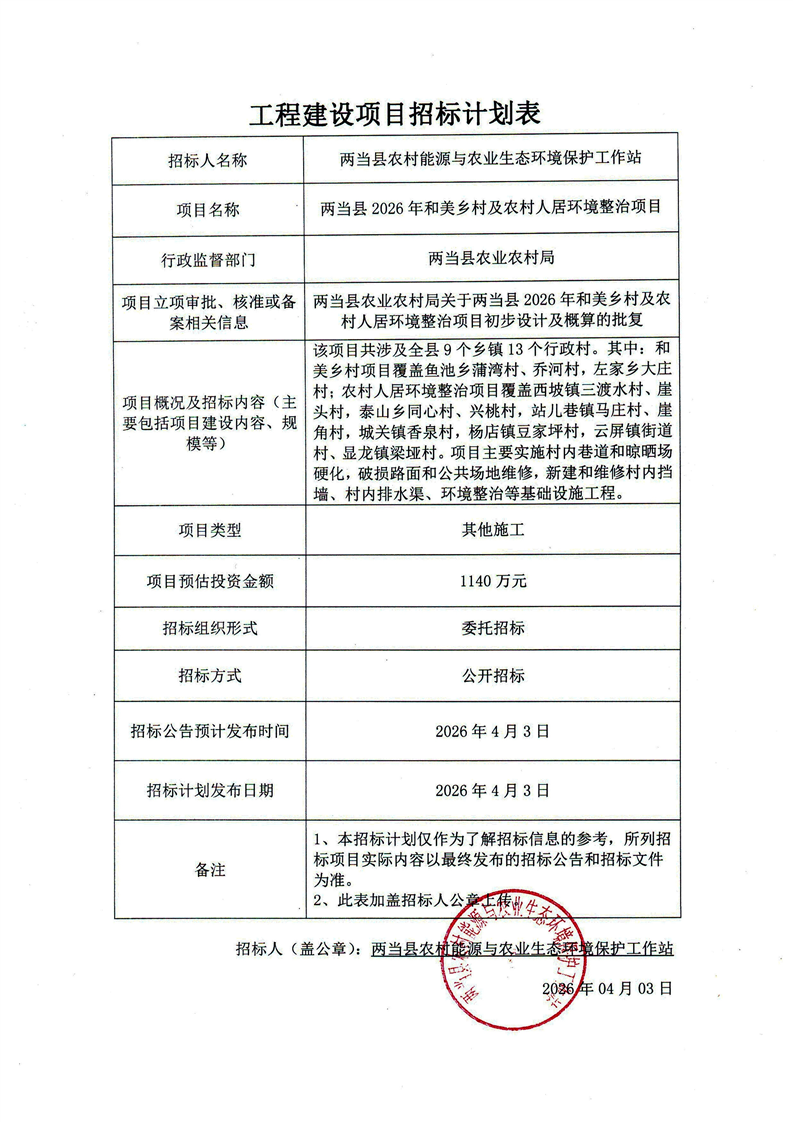兩當縣2026年和美鄉(xiāng)村及農村人居環(huán)境整治項目