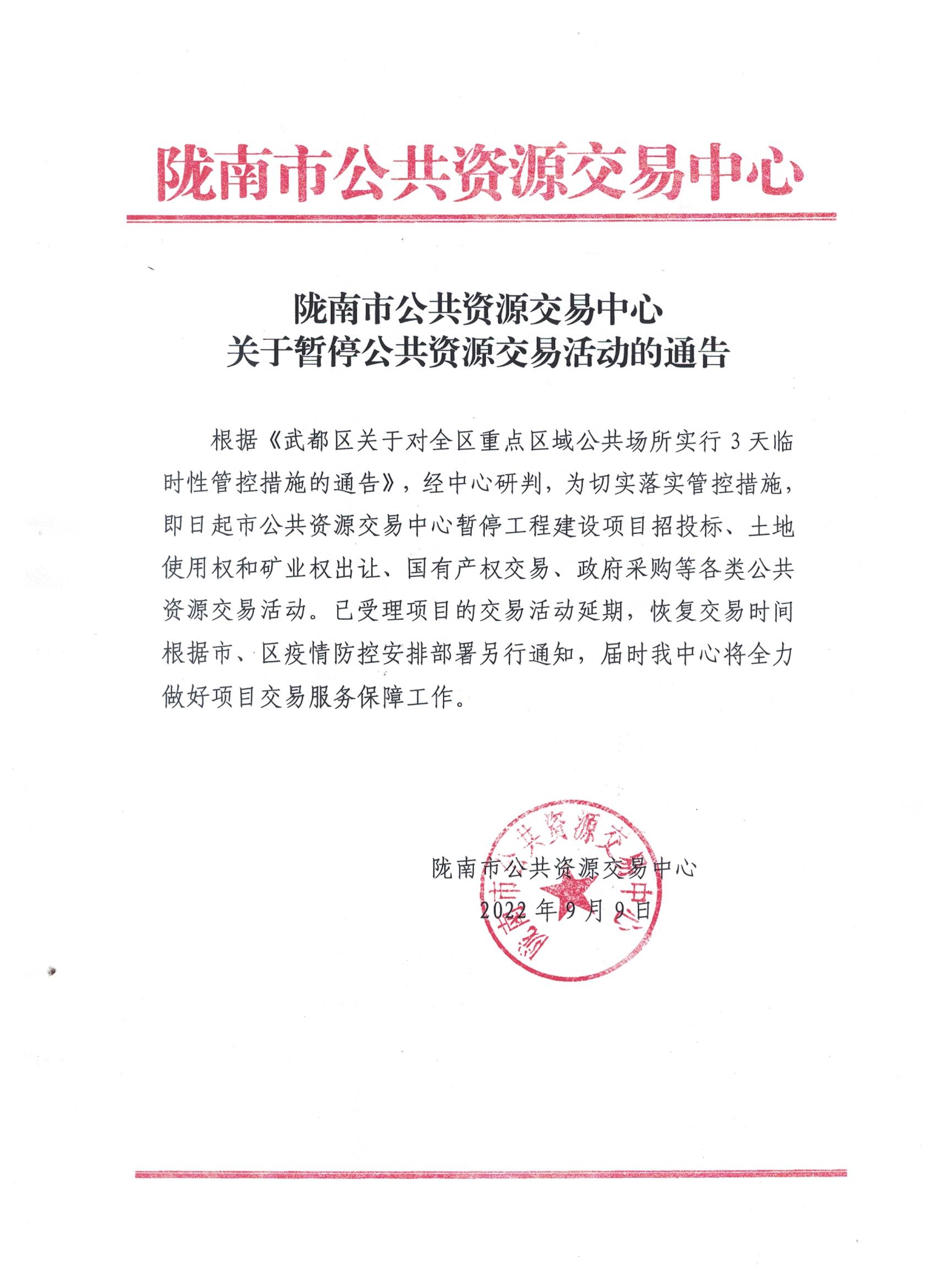 隴南市公共資源交易中心關(guān)于暫停公共資源交易活動(dòng)的通告