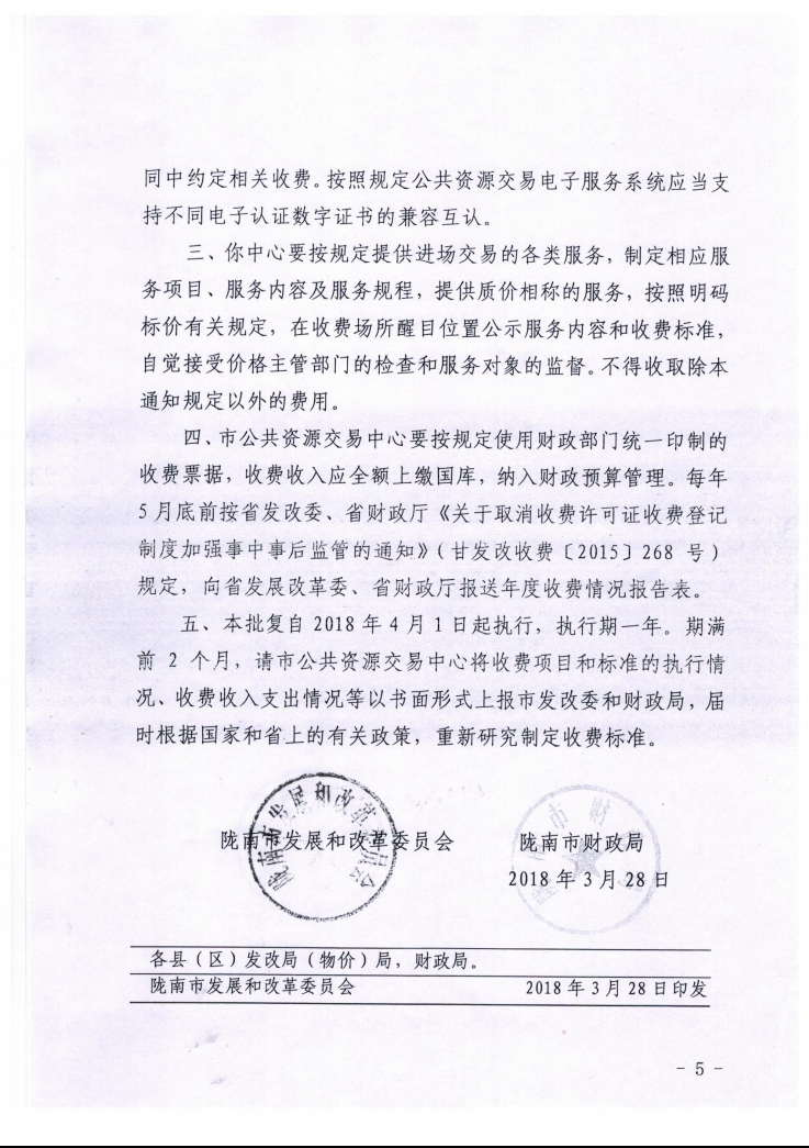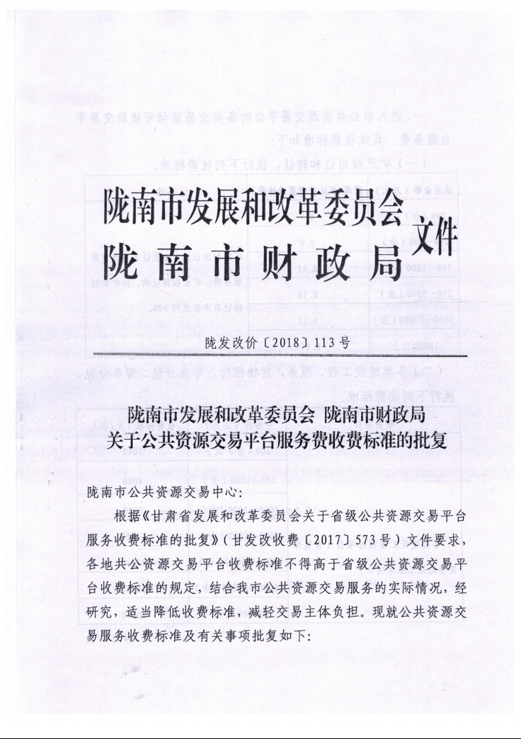 隴南市發(fā)展和改革委員會(huì) 隴南市財(cái)政局關(guān)于公共資源交易平臺(tái)服務(wù)費(fèi)收費(fèi)標(biāo)準(zhǔn)的批復(fù)